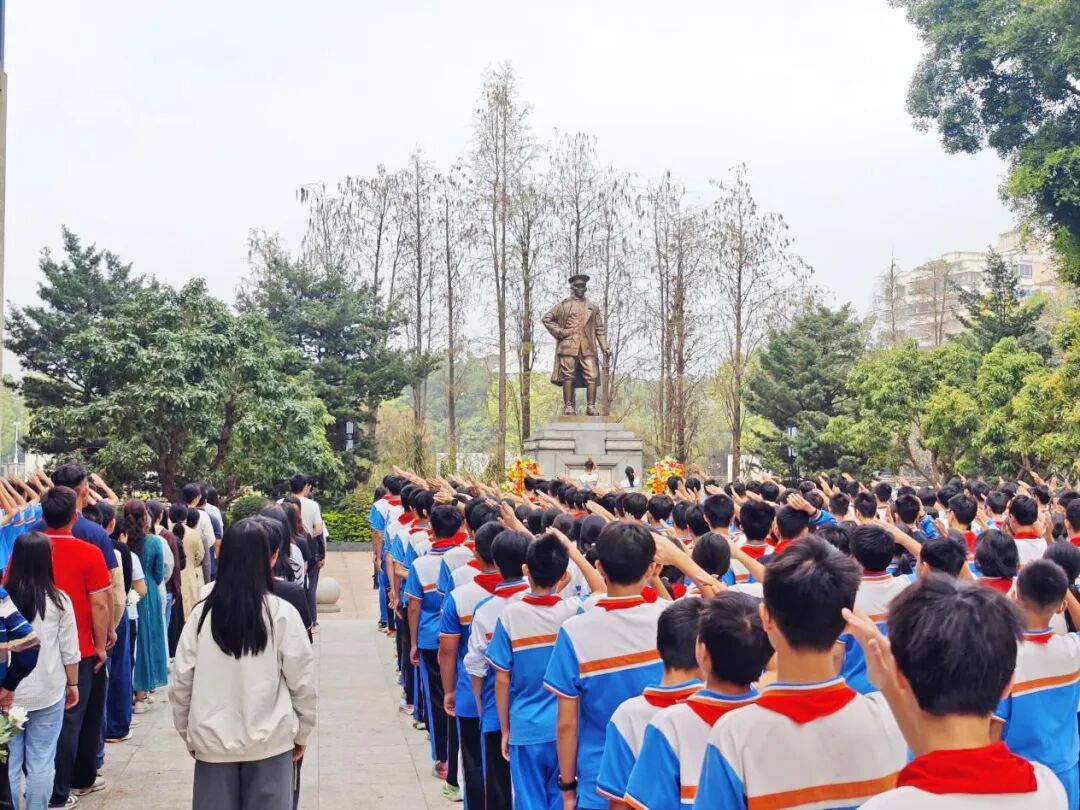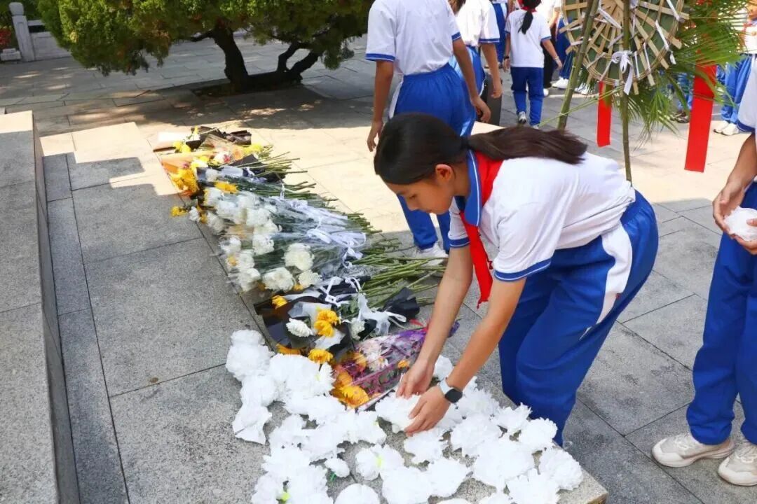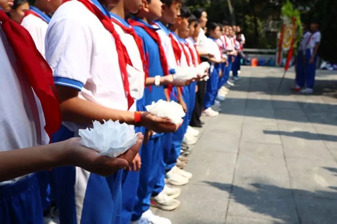 广大附中番禺实验学校组织师生赴三元里抗英烈士纪念碑及纪念馆开展“党团队同心祭英烈 传薪火奋进新征程”活动,全体人员齐唱国歌、敬献花圈、深深三鞠躬,随后参观纪念馆,在沉浸式学习中坚定理想信念。