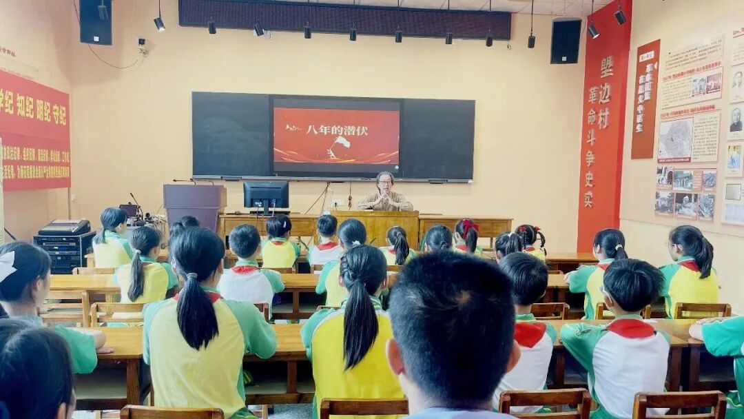 石碁镇中心小学以清明缅怀先烈为契机,走进塱边村松露小学革命旧址,聆听《八年的潜伏》作者许星威讲述革命历史。